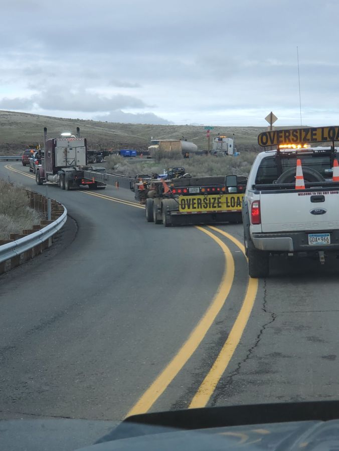 I was driving on Interstate 84 just east of Portland, Oregon and came up on a long, white, skinny thing on a trailer with regular looking cars in front and back. The semi truck hauling this trailer looked like a regular old semi truck, like the ones who have the big boxes. But the cars that were escorting this load had amber lights on the tops of their vehicles. They also had yellow signs with “OVERSIZE LOAD” printed in black letters on them. They both had CB antennas too. I recognized them as Pilot Cars I’d seen before with Mobile Homes.