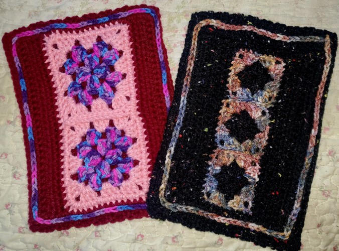 In the photo above, I used a basic shell to crochet the 2 sides together. For the brown one on the left, I added a slip stitch row just to play around with it. As far as weaving in the ends; I insert my hook in between the 2 sides and near the middle of one side. Which side doesn’t matter. Work the hook through those sides up to where there’s a hole at the tail of the yarn. Yarn over and pull the tail in between the sides. Give your pot holder a stretch and the end of the yarn should disappear inside. If not, pull it just a little tight, snip off the end and then give it a stretch and your tail will be pulled inside the potholder. Don’t worry, I’ve not ever had one come apart on me in all the years I’ve been making these.